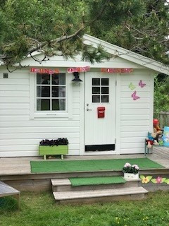 Når barnas utelekeplass skulle planlegges, var det viktig for oss å ta vare på naturen og de mange muligheter uberørt natur gir barn. Vi har tatt vare på skogen og de gode klatretrærne der vi kan gjemme oss under store greiner. Samtidig har vi flere områder med hus og lekeapparater som innbyr til rollelek